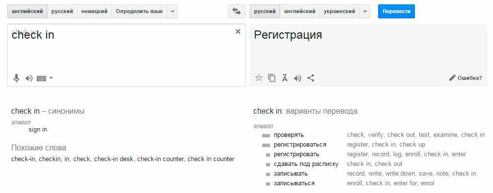 CHECK IN — значит «регистрация». Также Гугл предлагает нам глаголы этого слова: