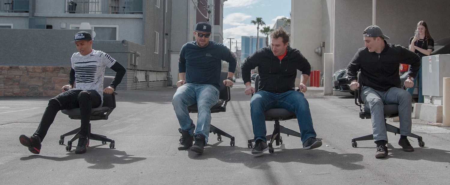 В гранд-финале «Седалищных гонок» на креслах принимают участие 16 человек. Для них заготовили 16 «гоночных» кресел на колесиках.