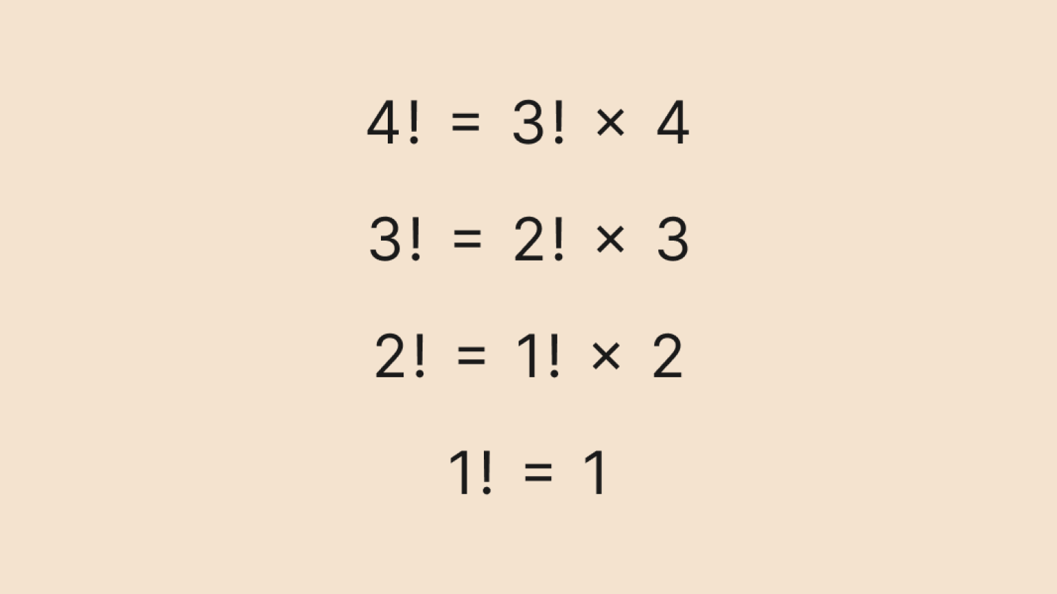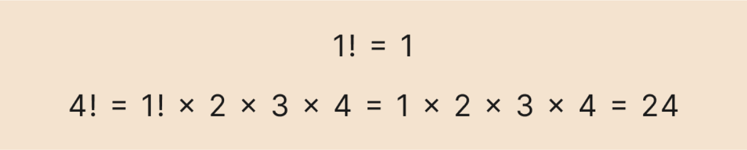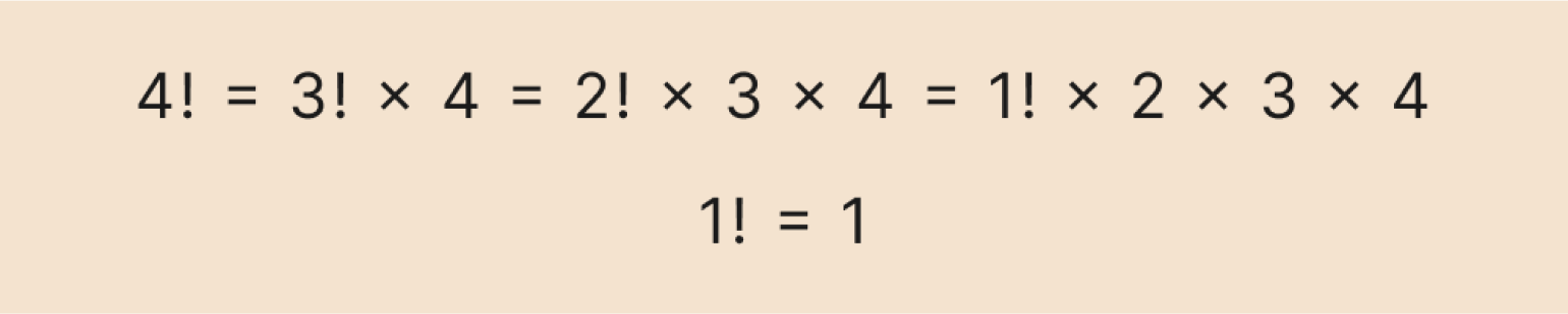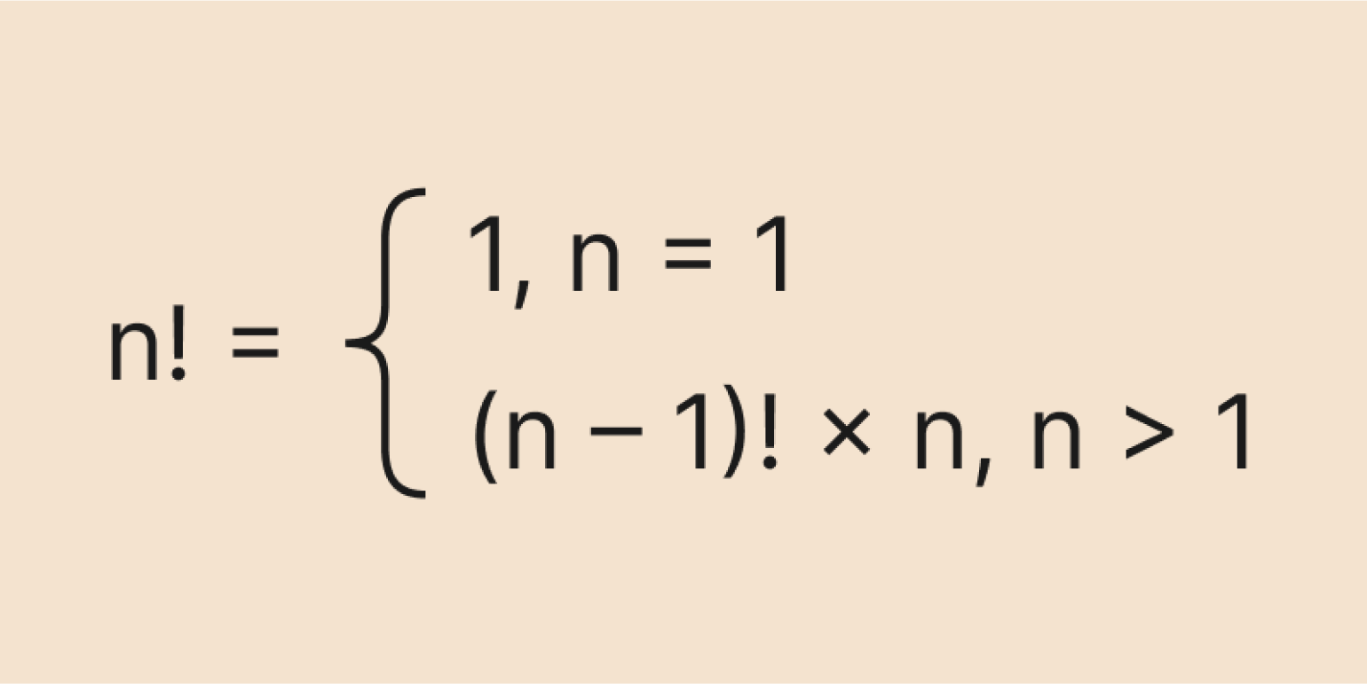 Однако рекуррентная формула хорошо подходит для алгоритмов — в частности, для программирования. Мы можем задать начальное значение: например, что 0! = 1 или 1! = 1, а затем считать следующие факториалы по формуле: