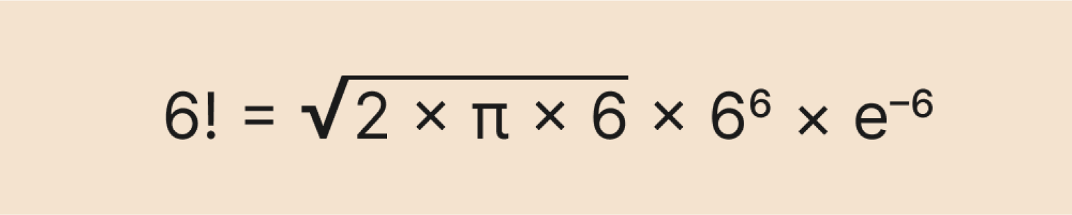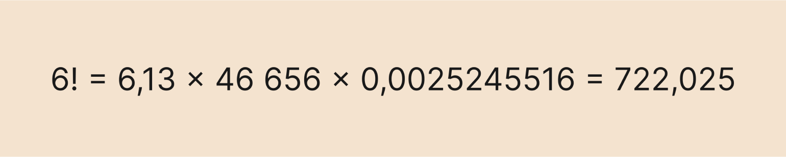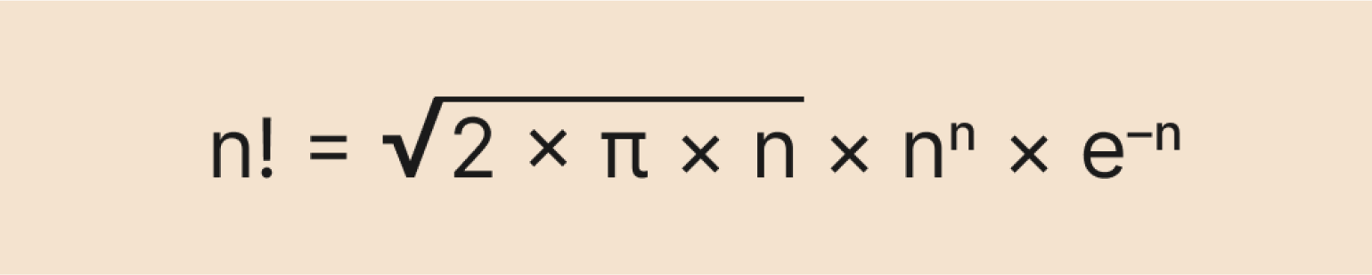 Выглядит страшно, но на самом деле она очень полезная. Её используют, когда хотят приблизительно узнать факториал большого числа. Обычным способом это будет сделать сложно даже мощному компьютеру — например, попробуйте посчитать в онлайн-калькуляторе факториал числа 10 024 (спойлер: это может занять несколько часов и даже дней).