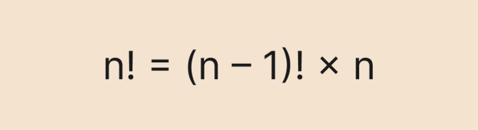 - Рекурсия: n! = (n – 1)! × n. Это основное свойство факториалов, о нём мы чуть подробнее поговорим дальше.