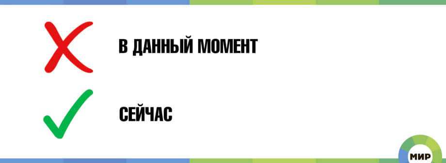 «В данный момент» – это еще одно выражение-перебежчик из официально-делового стиля. В отчетах ведомств оно уместно, например, когда отчитываются специалисты. Допустим, несколько часов назад где-то произошел пожар, а в данный момент, то есть на момент речи, уже ведутся спасательные работы. При этом и говорящий, и слушатель понимают, что через час эта информация может устареть, появятся новые подробности.
