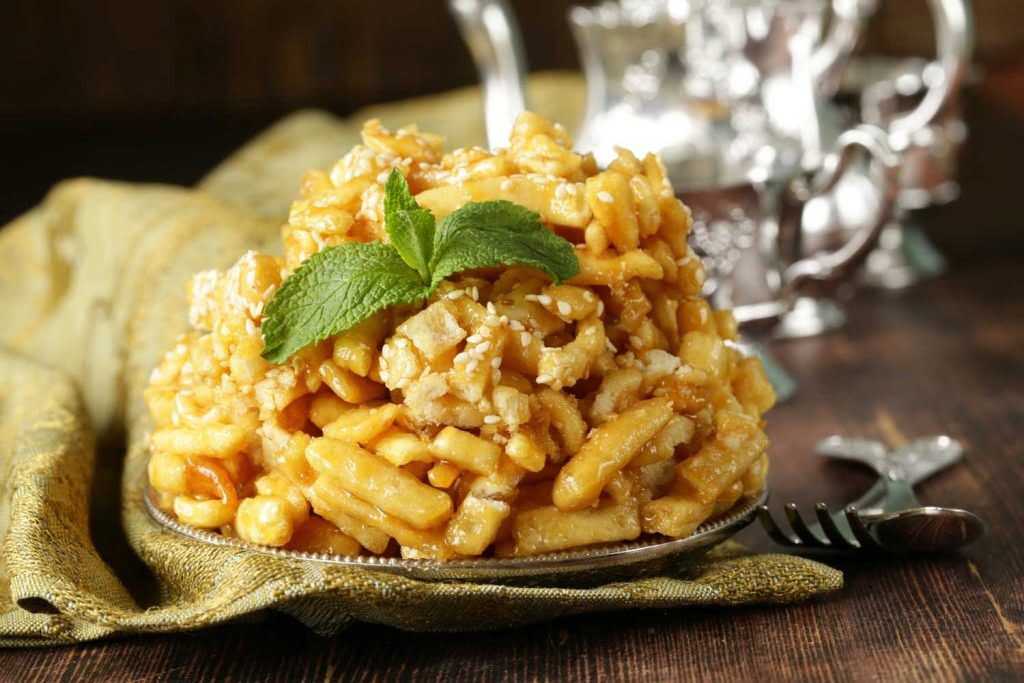 Когда обжаренные «палочки» остынут, их нужно перемешать с горячим медовым сиропом и выложить в виде горки. Сироп готовится из сахара, воды и меда.